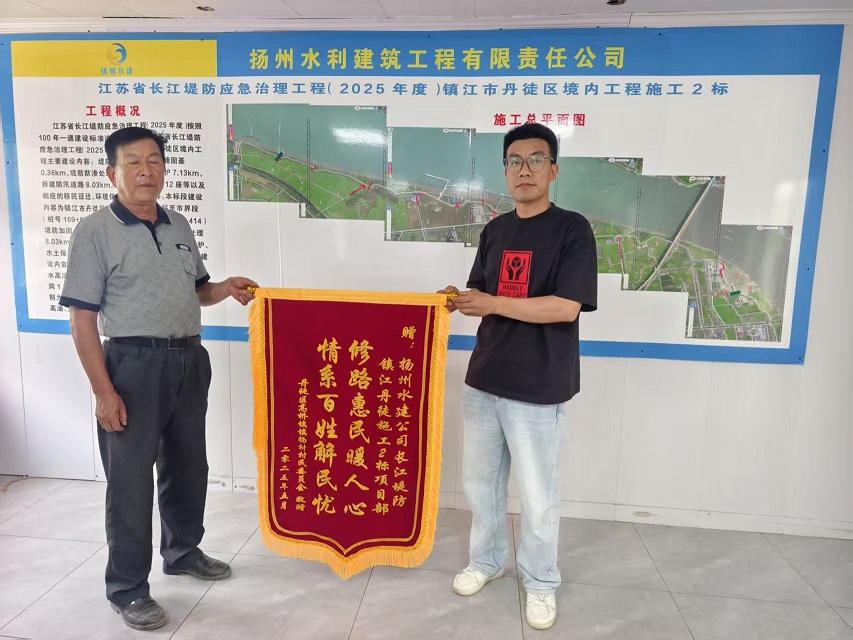 【概要描述】5月20日,一面鐫刻著"修路惠民暖人心,情系百姓解民憂"的鮮紅錦旗,由鎮(zhèn)江市丹徒區(qū)高橋鎮(zhèn)鎮(zhèn)揚村村委會鄭重贈予揚州水利建筑工程有限責任公司江蘇省長江堤防應急治理工程(2025年度)丹徒區(qū)一期施工2標項目部,這面錦旗不僅承載著村民的深情厚誼,更是對國企民生擔當?shù)纳鷦釉忈??! ∽鳛槭〖壷攸c水利工程,該項目嚴格遵循百年一遇防洪標準,公司承建的丹徒區(qū)一期施工2標項目內容主要包括江堤南江泵站至市界段堤防加固、